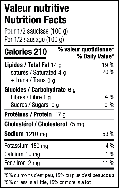 Porc, Eau, Farine de blé, Sel, Fécule de tapioca, Épices, Acétate de sodium, Phosphate de sodium, Poivron rouge déshydraté,