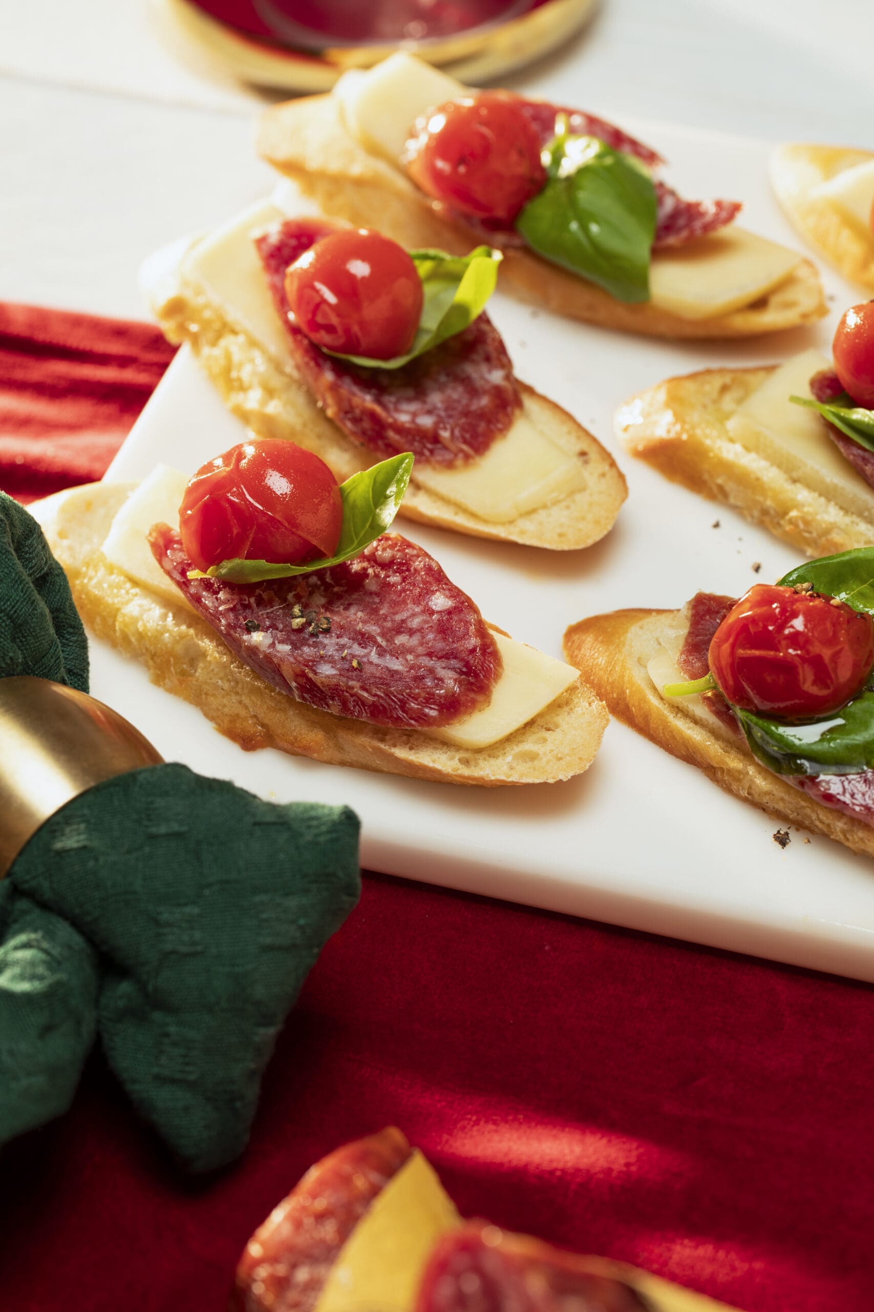 Our salaminos are perfect for simple, delicious crostini recipes. Simply place a slice of Salamino Genova and a slice of Caciocavallo cheese on top of a delicate olive oil crouton. For a boost of flavour, remember to season your bread with your favourite spices before putting it in the oven. As for the cheese, anything goes! And to top it all off, a bit of basil and tomato confit will add colour and freshness to your crostini.