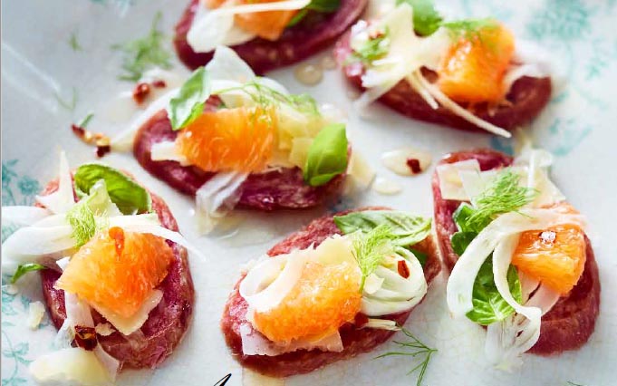 Salamino slices are perfect as a base for your appetizers. For example, they’ve replaced the traditional croutons in these delectable salami bites. Combining the freshness of basil, minced fennel and orange supremes with the saltiness of Parmesan shavings and salami, these appetizers are sure to steal the show. A drizzle of homemade hot honey will balance everything out, as well as please those with a sweet tooth.