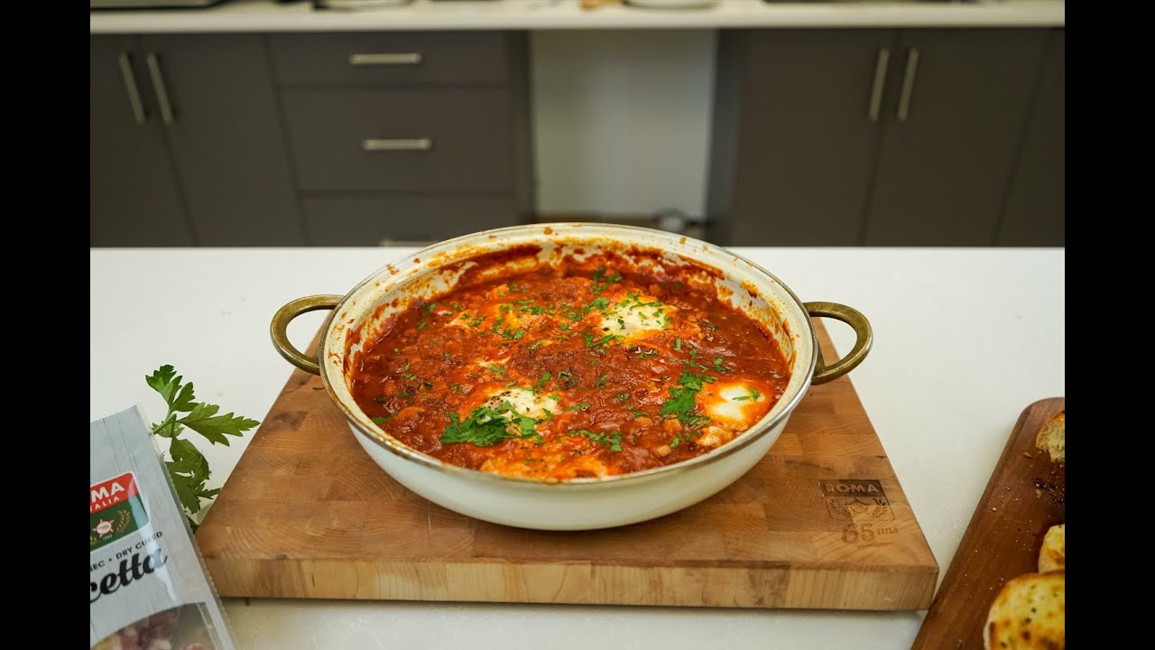 Ce shakshuka amatriciana est le plat parfait avec de la pancetta pour toutes les occasions. Laisser mijoter la sauce tomate, les oignons, l’ail et la pancetta Roma d’Italia. Nous aimons préparer cette recette pour un dîner de partage à table.